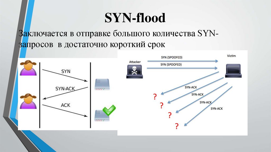 SYN-floodЗаключается в отправке большого количества SYNзапросов в достаточно короткий срок