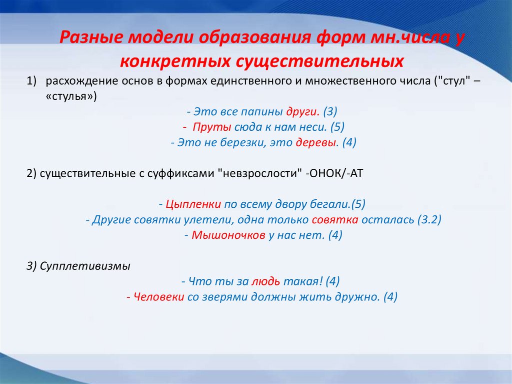 1) расхождение основ в формах единственного и множественного числа ("стул" –