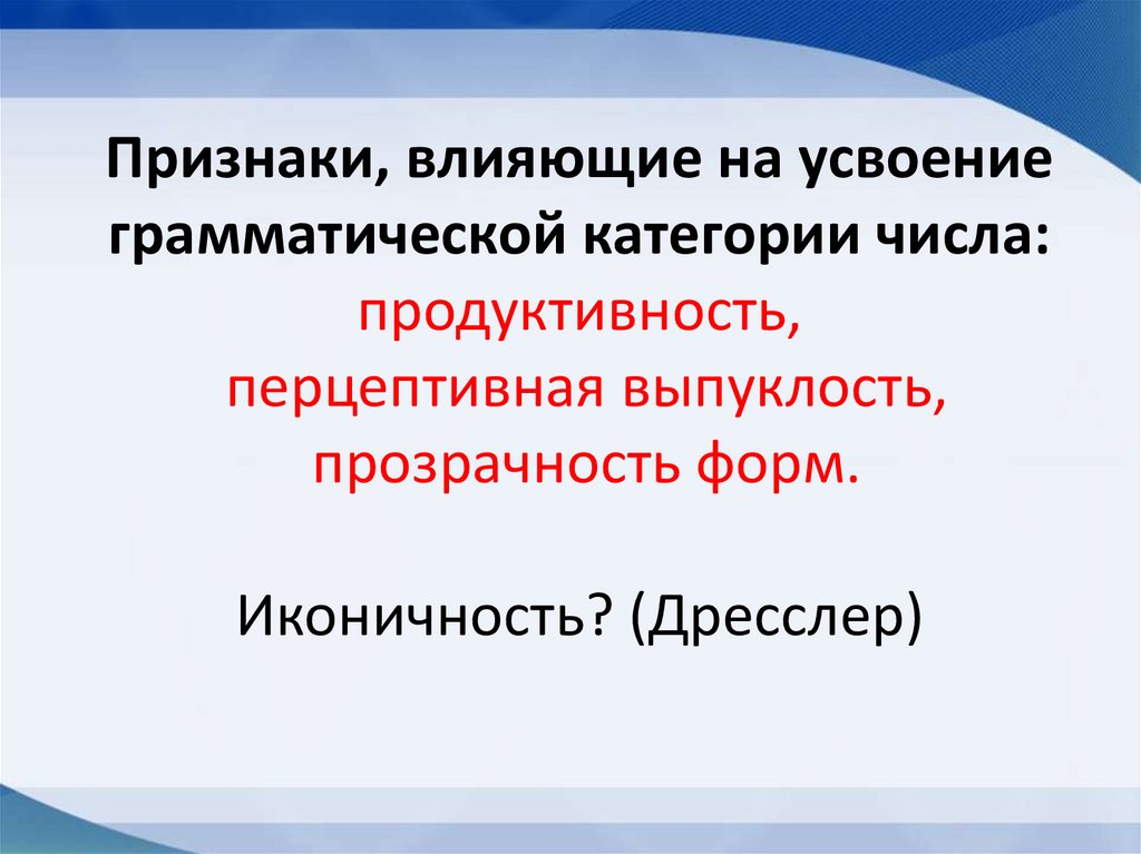Признаки, влияющие на усвоениеграмматической категории числа: