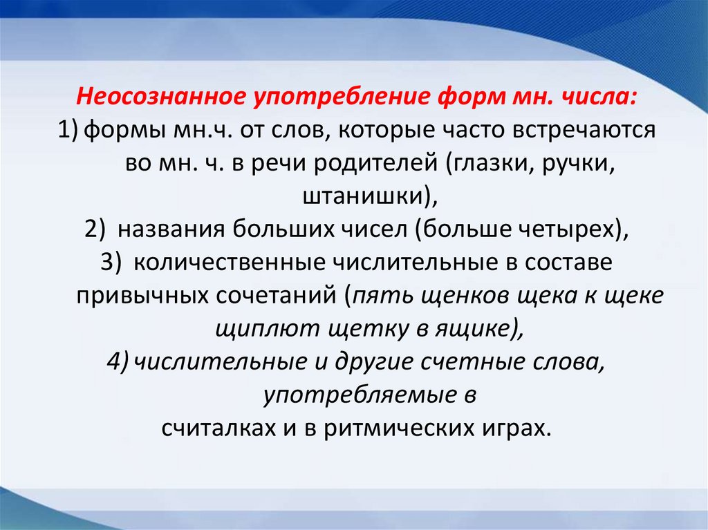 Неосознанное употребление форм мн. числа:1) формы мн.ч. от слов, которые часто встречаются