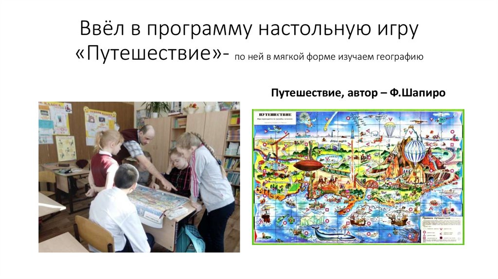 Ввёл в программу настольную игру«Путешествие»- по ней в мягкой форме изучаем географию