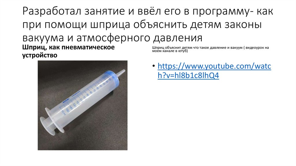 Разработал занятие и ввёл его в программу- какпри помощи шприца объяснить детям законы