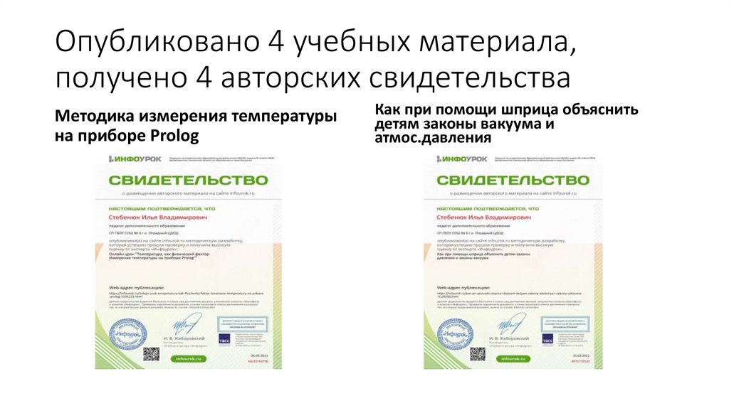 Опубликовано 4 учебных материала,получено 4 авторских свидетельства