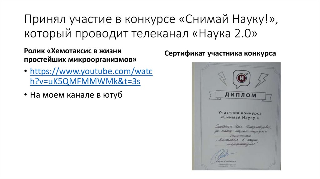 Принял участие в конкурсе «Снимай Науку!»,который проводит телеканал «Наука 2.0»