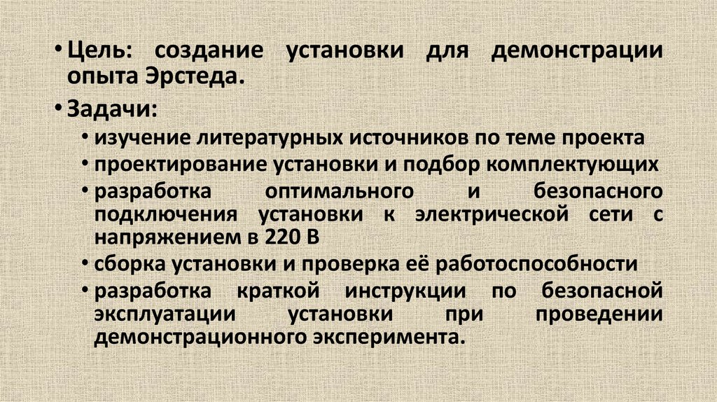 • Цель: создание установки для демонстрацииопыта Эрстеда.