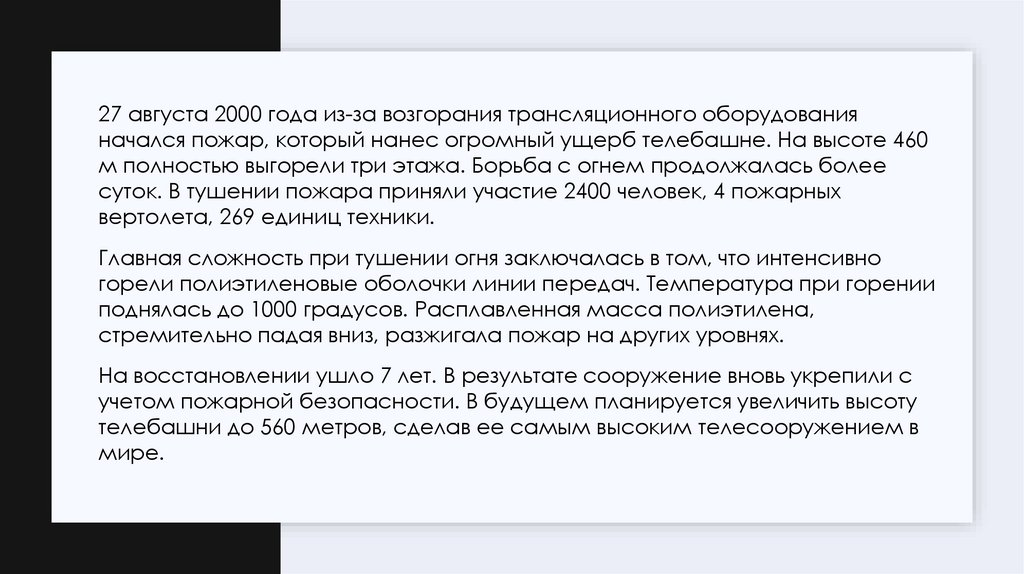 27 августа 2000 года из-за возгорания трансляционного оборудованияначался пожар, который нанес огромный ущерб телебашне. На высоте 460