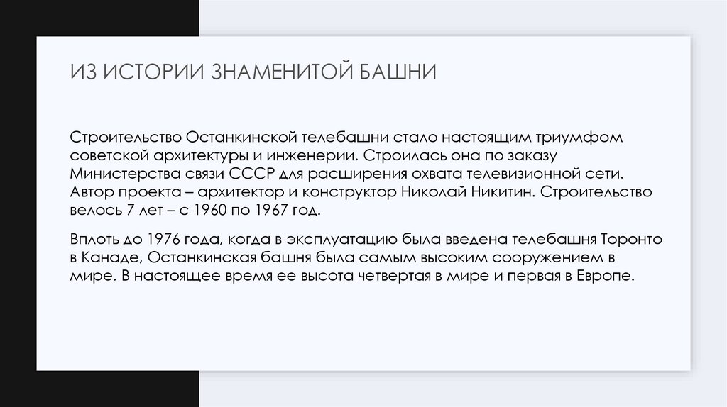ИЗ ИСТОРИИ ЗНАМЕНИТОЙ БАШНИСтроительство Останкинской телебашни стало настоящим триумфом