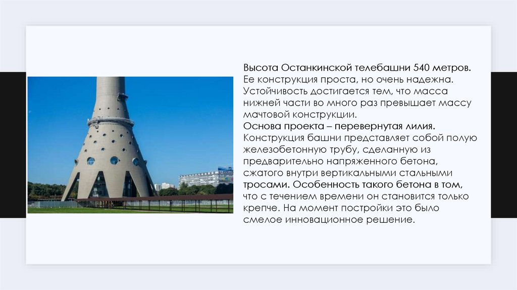 Высота Останкинской телебашни 540 метров.Ее конструкция проста, но очень надежна.