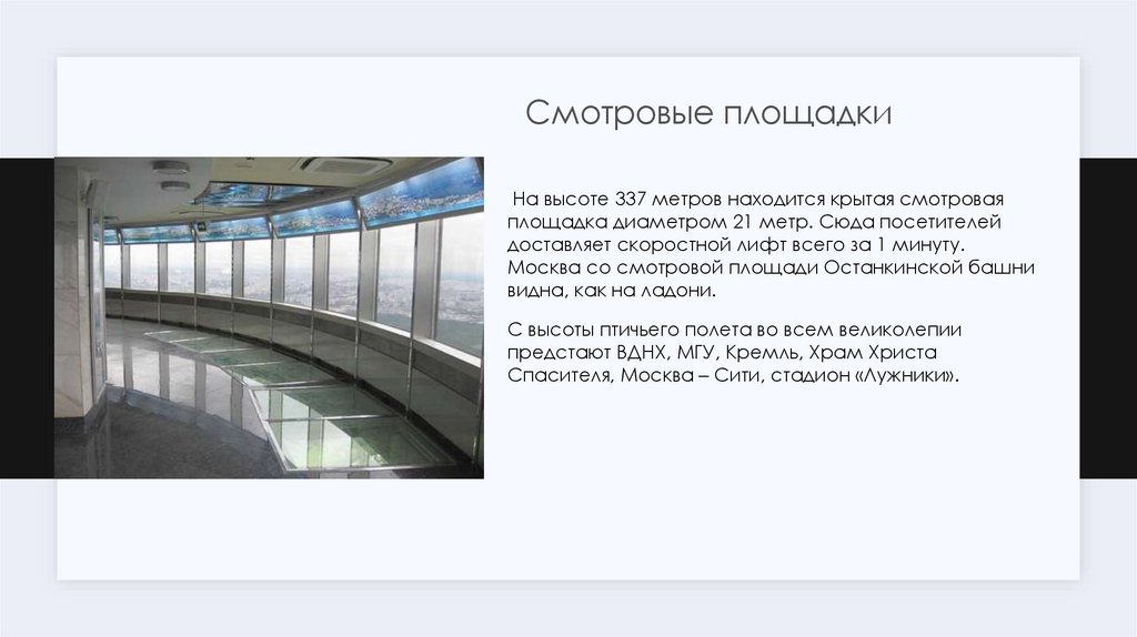 Смотровые площадкиНа высоте 337 метров находится крытая смотровая