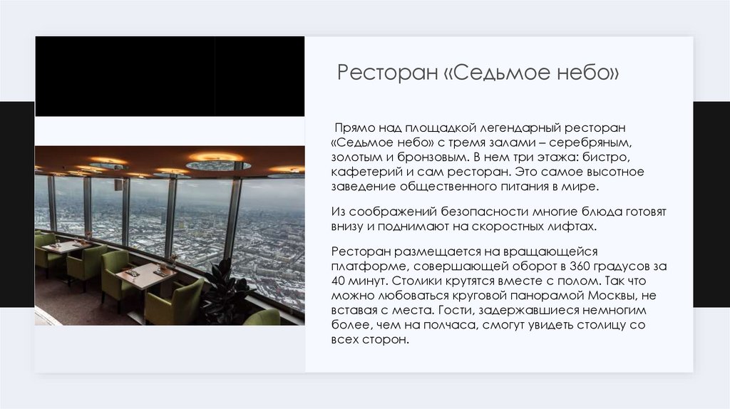 Ресторан «Седьмое небо»Прямо над площадкой легендарный ресторан