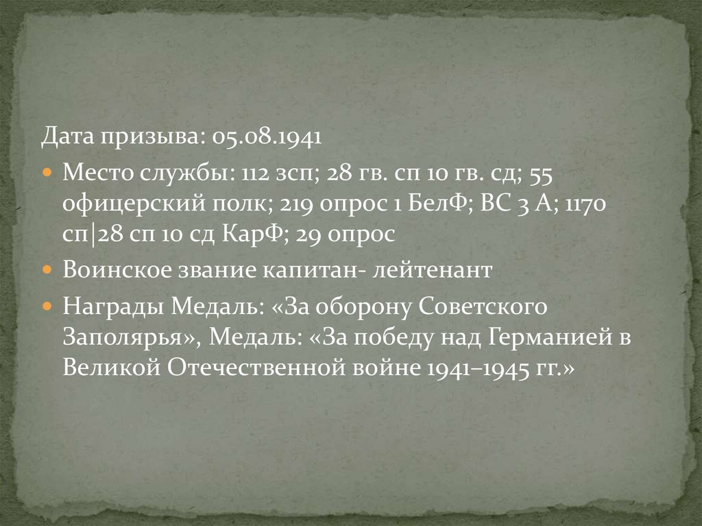 Дата призыва: 05.08.1941Место службы: 112 зсп; 28 гв. сп 10 гв. сд; 55