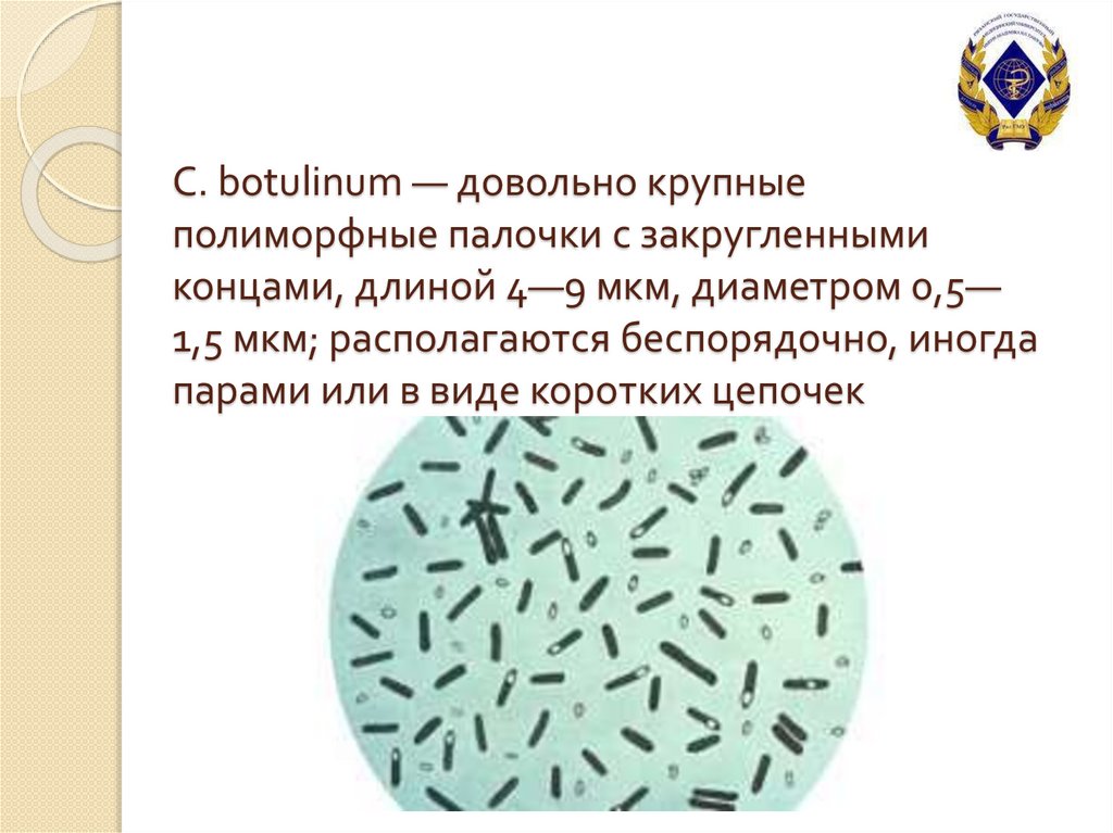 С. botulinum — довольно крупныеполиморфные палочки с закругленными
