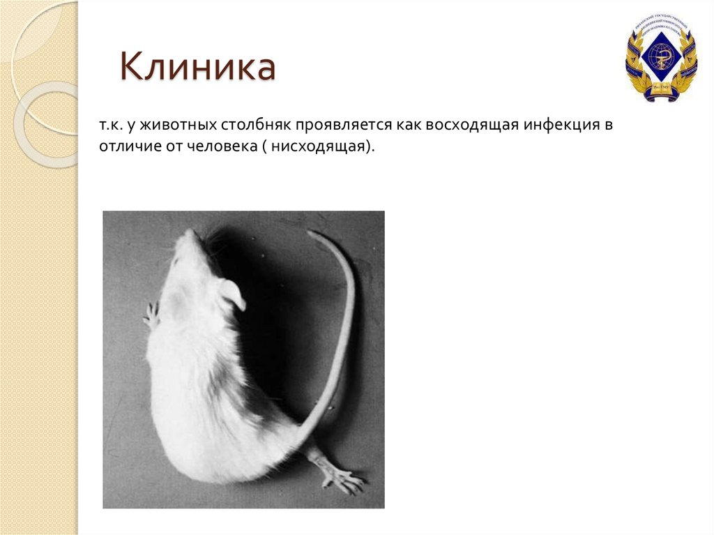 Клиникат.к. у животных столбняк проявляется как восходящая инфекция в