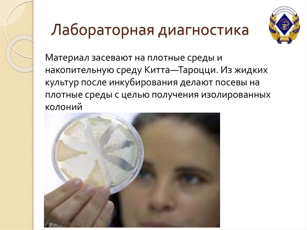 Лабораторная диагностикаМатериал засевают на плотные среды и