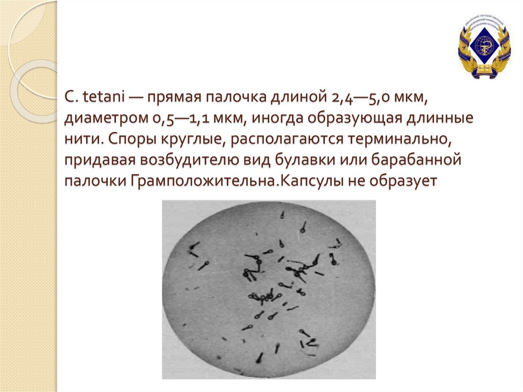 С. tetani — прямая палочка длиной 2,4—5,0 мкм,диаметром 0,5—1,1 мкм, иногда образующая длинные