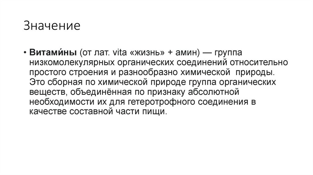 Значение• Витами́ны (от лат. vita «жизнь» + амин) — группа