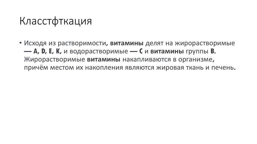 Класстфткация• Исходя из растворимости, витамины делят на жирорастворимые