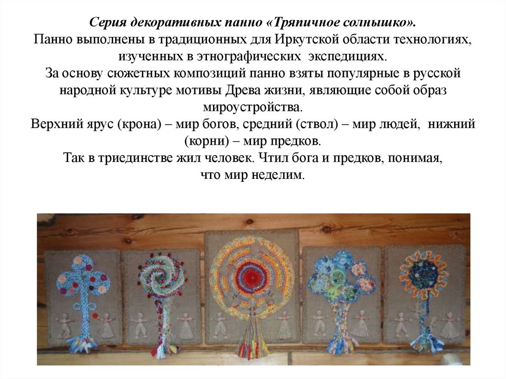 Серия декоративных панно «Тряпичное солнышко».Панно выполнены в традиционных для Иркутской области технологиях,