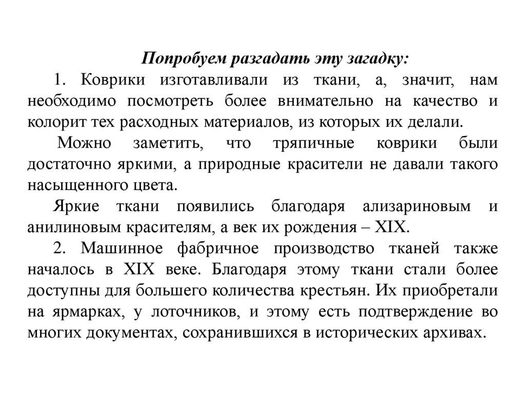 Попробуем разгадать эту загадку:1. Коврики изготавливали из ткани, а, значит, нам