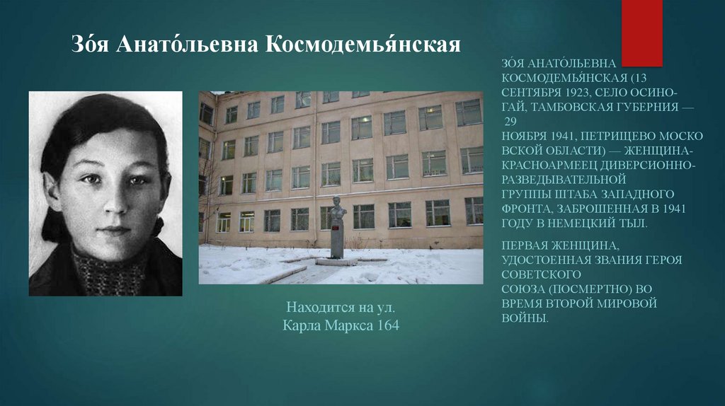 Зо́я Анато́льевна Космодемья́нскаяНаходится на ул.