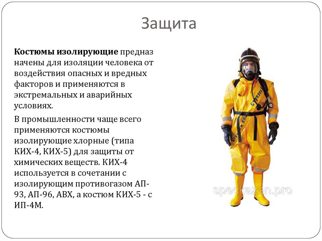 изолирующим противогазом АП93, АП-96, АВХ, а костюм КИХ-5 - с