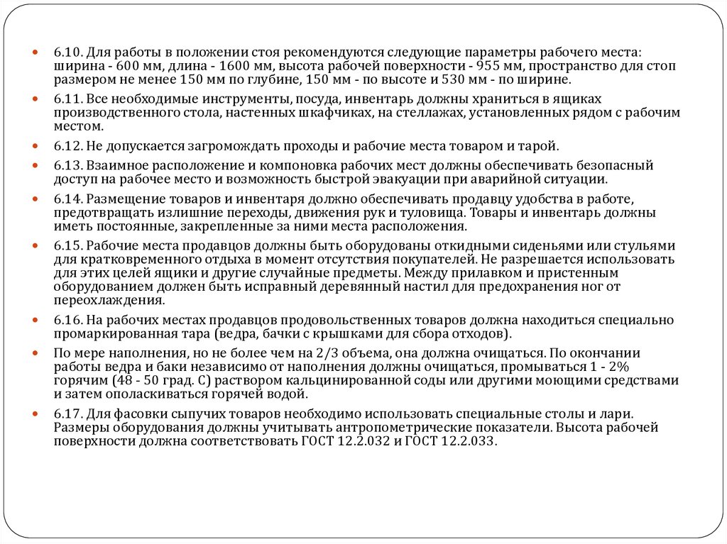 6.1. При организации рабочих мест следует руководствоваться ГОСТ 12.2.032, ГОСТ 12.2.033, ГОСТ 12.2.049, ГОСТ