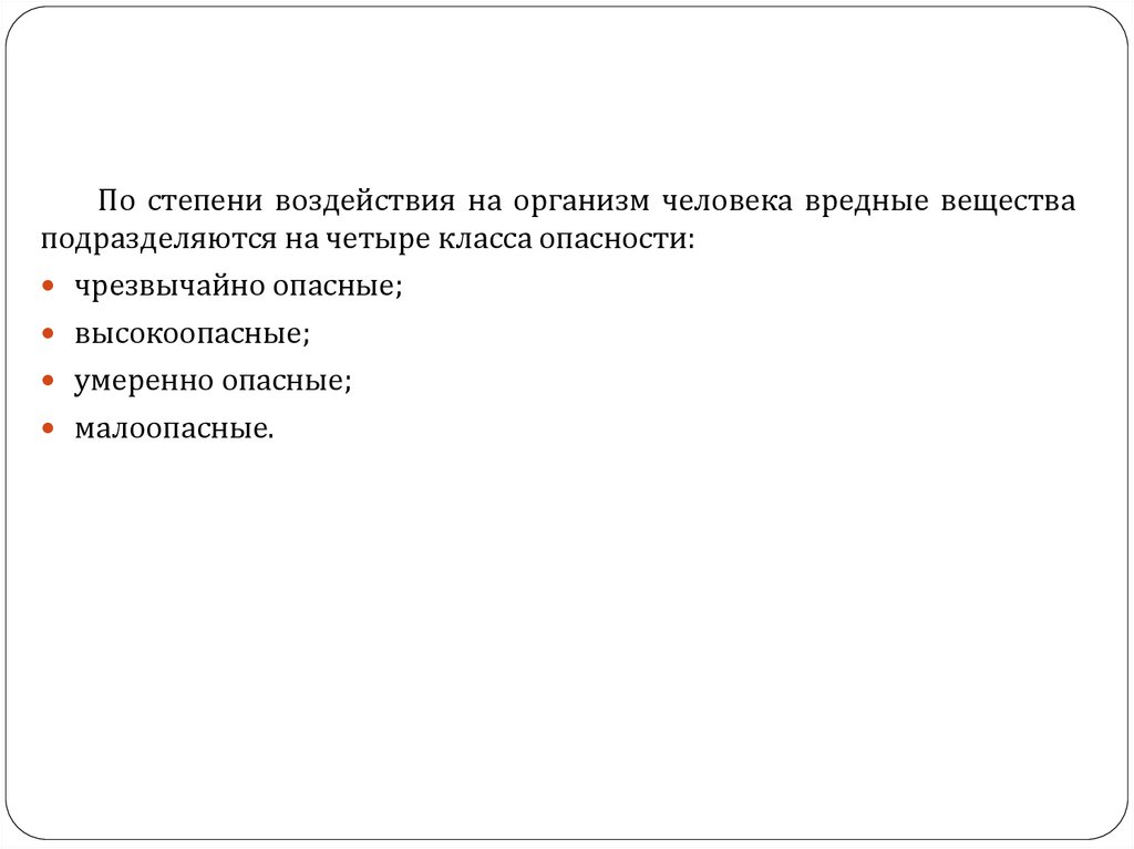 По степени воздействия на организм человека вредные веществаподразделяются на четыре класса опасности:
