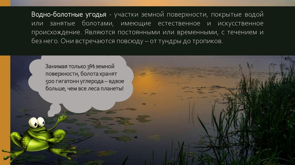 Водно-болотные угодья - участки земной поверхности, покрытые водойили занятые болотами, имеющие естественное и искусственное