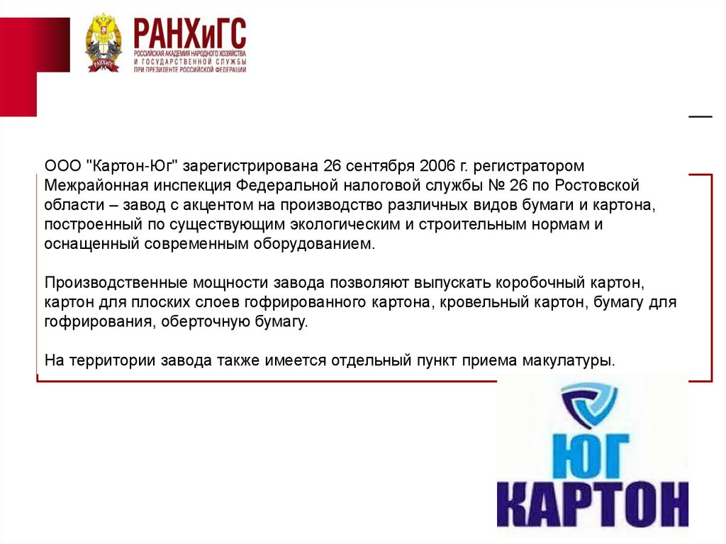Налог на добавленную стоимостьООО "Картон-Юг" зарегистрирована 26 сентября 2006 г. регистратором
