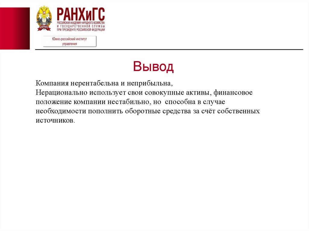 ВыводКомпания нерентабельна и неприбыльна,