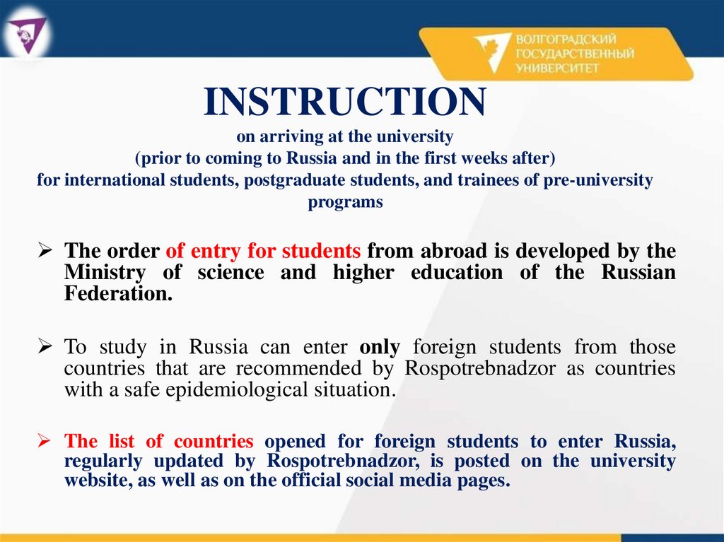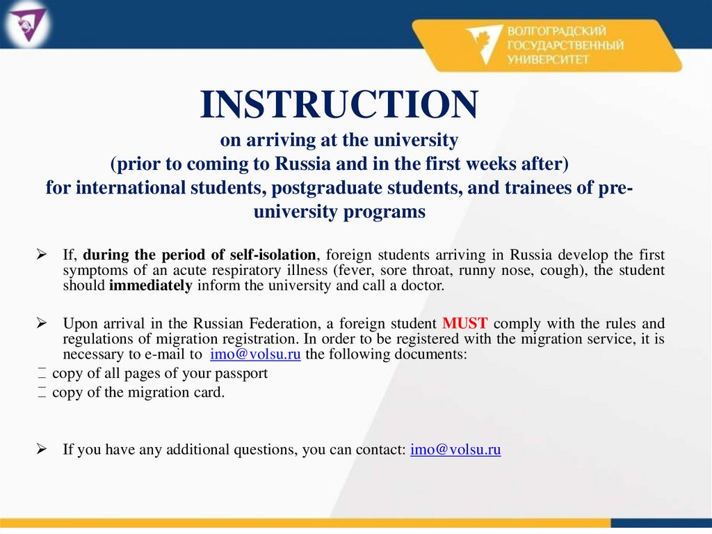 Before coming to Russia, it is mandatory to notify the University by the email imo@volsu.ru at least 10
