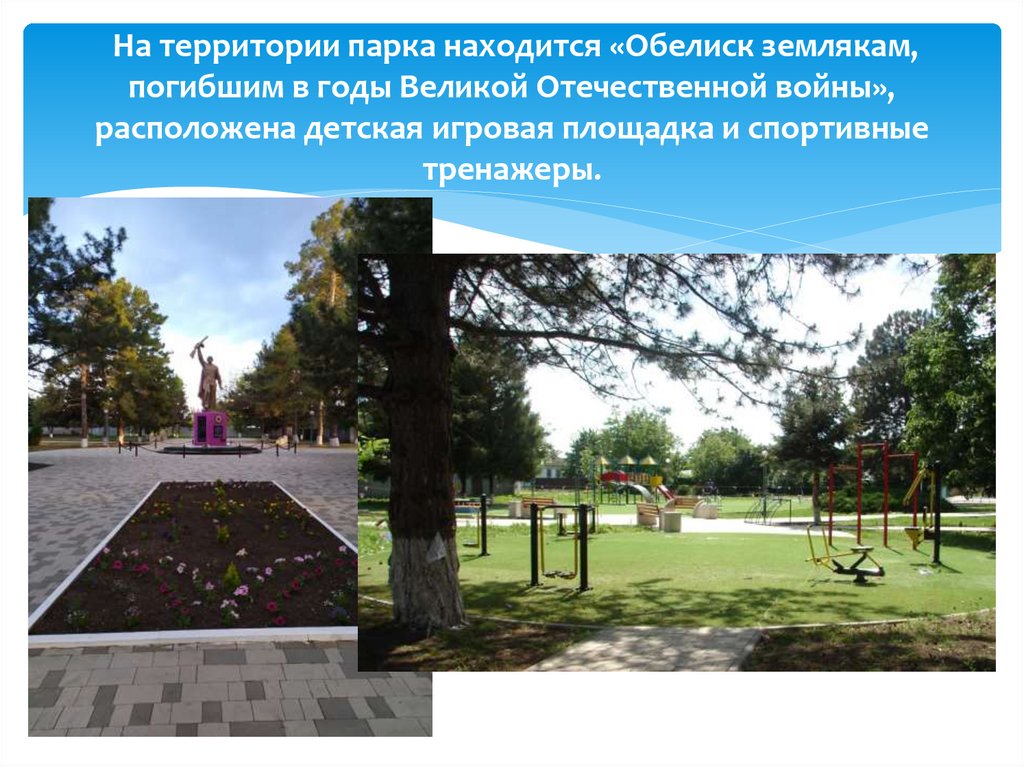 На территории парка находится «Обелиск землякам,погибшим в годы Великой Отечественной войны»,