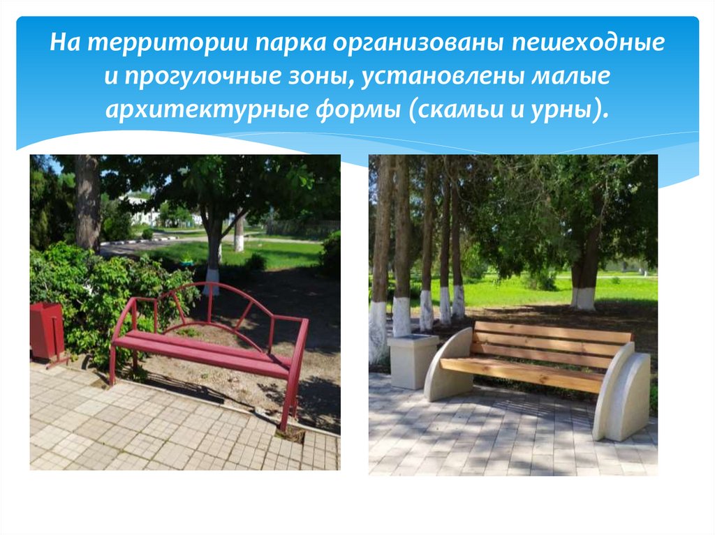 На территории парка организованы пешеходныеи прогулочные зоны, установлены малые