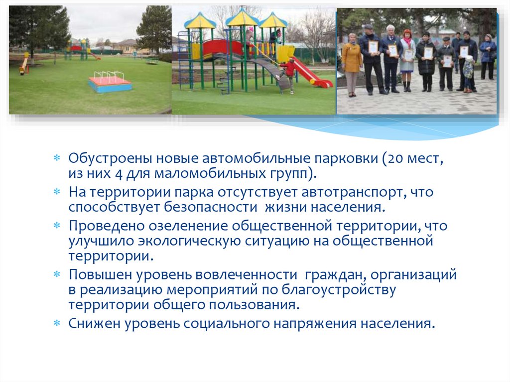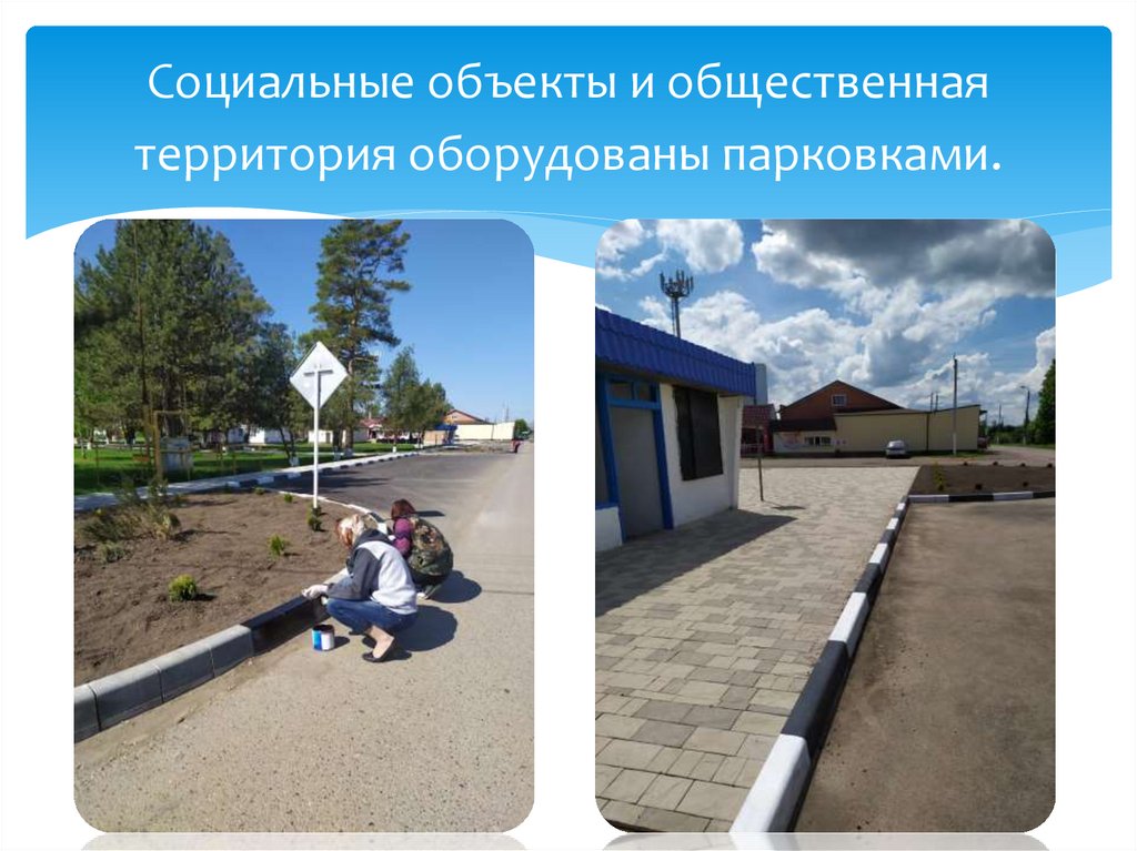 Социальные объекты и общественнаятерритория оборудованы парковками.
