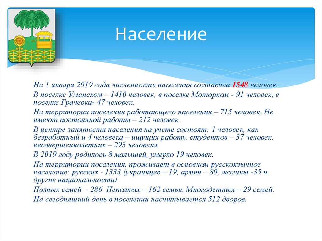 В поселке Уманском – 1410 человек, в поселке Моторном - 91 человек, в