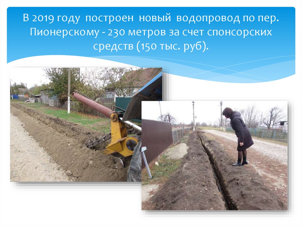 В 2019 году построен новый водопровод по пер.Пионерскому - 230 метров за счет спонсорских