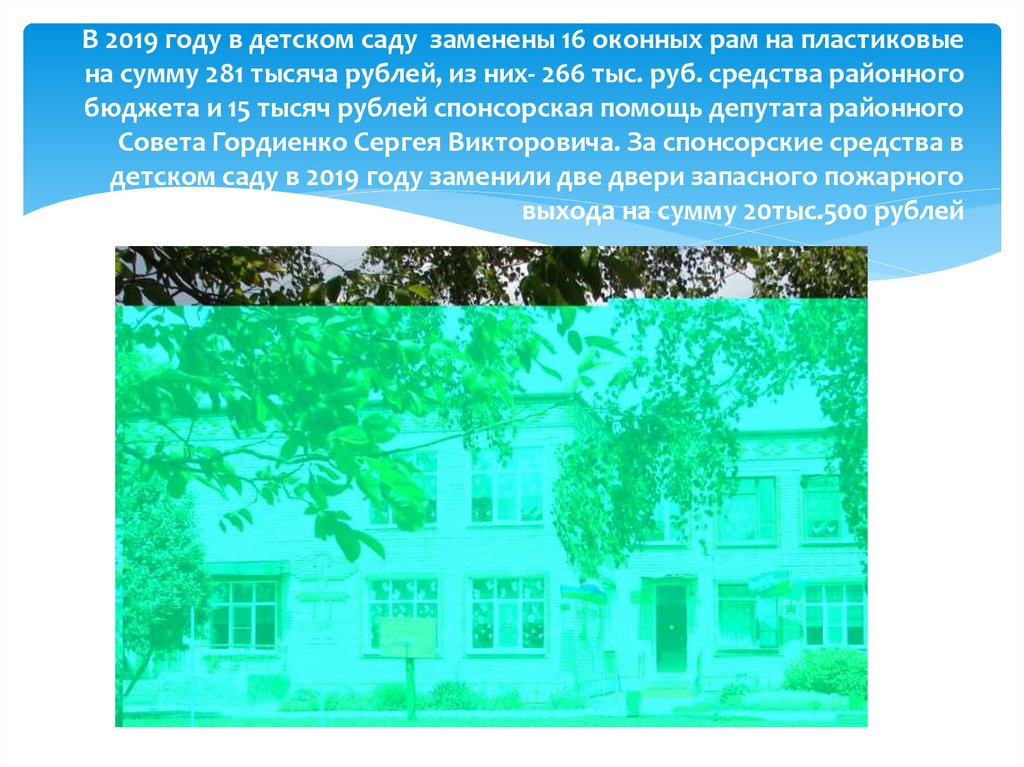 В 2019 году в детском саду заменены 16 оконных рам на пластиковыена сумму 281 тысяча рублей, из них- 266 тыс. руб. средства районного
