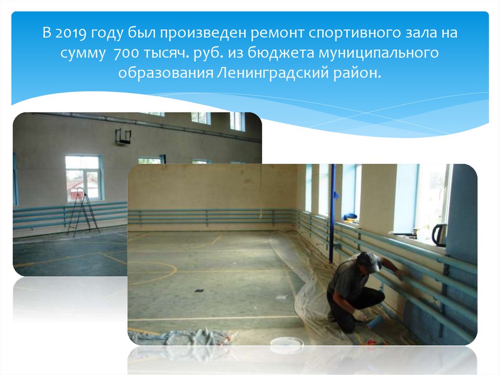 В 2019 году был произведен ремонт спортивного зала насумму 700 тысяч. руб. из бюджета муниципального