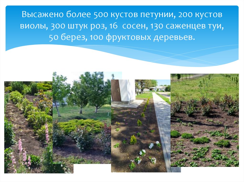 Высажено более 500 кустов петунии, 200 кустоввиолы, 300 штук роз, 16 сосен, 130 саженцев туи,