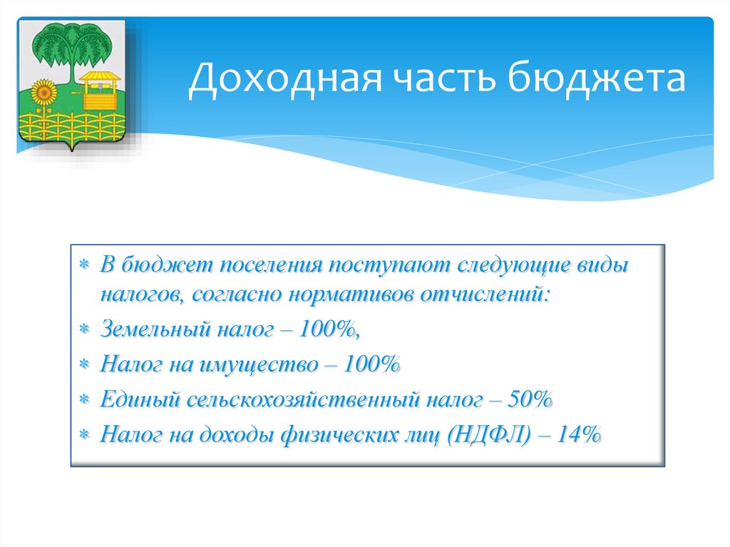 Доходная часть бюджетаВ бюджет поселения поступают следующие виды