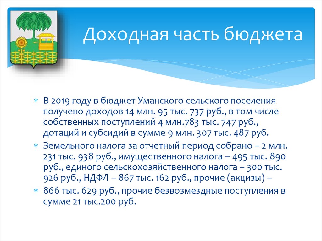 Доходная часть бюджетаВ 2019 году в бюджет Уманского сельского поселения