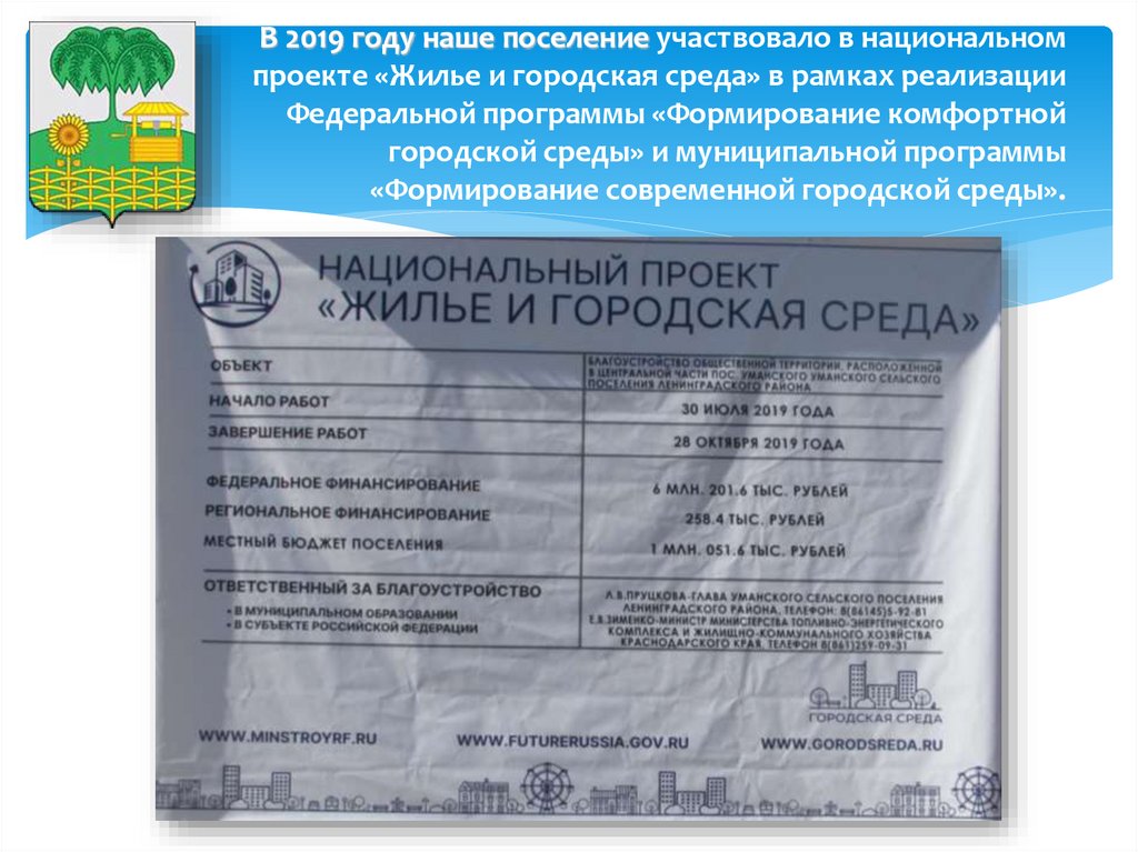 В 2019 году наше поселение участвовало в национальномпроекте «Жилье и городская среда» в рамках реализации
