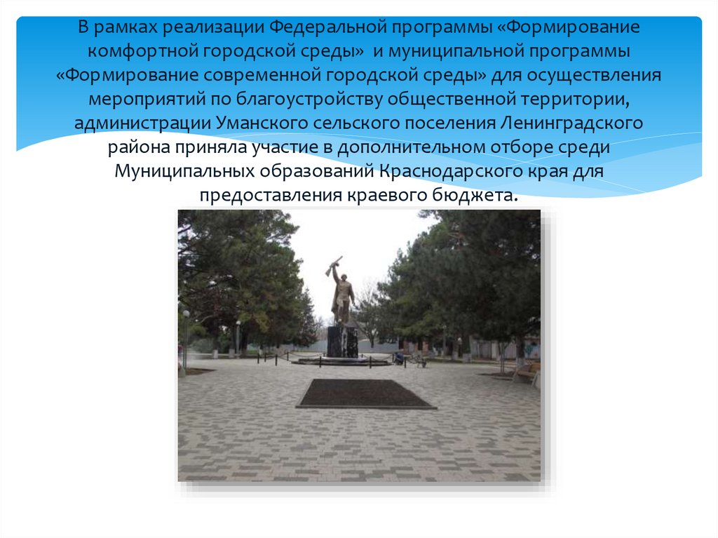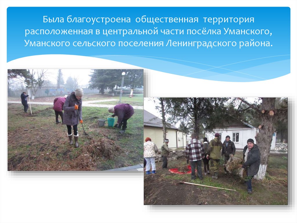 Была благоустроена общественная территориярасположенная в центральной части посёлка Уманского,