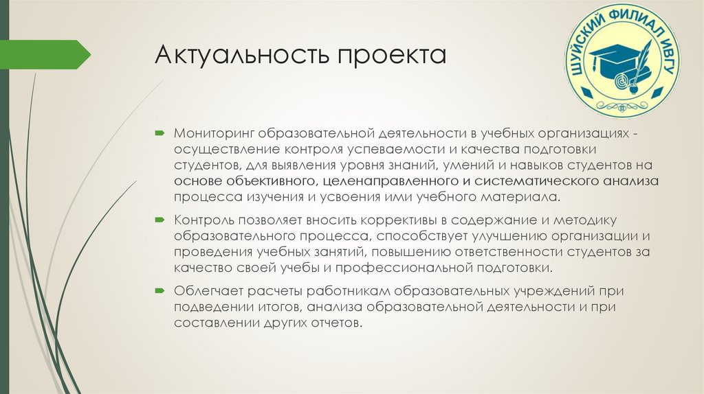Актуальность проектаМониторинг образовательной деятельности в учебных организациях осуществление контроля успеваемости и качества подготовки