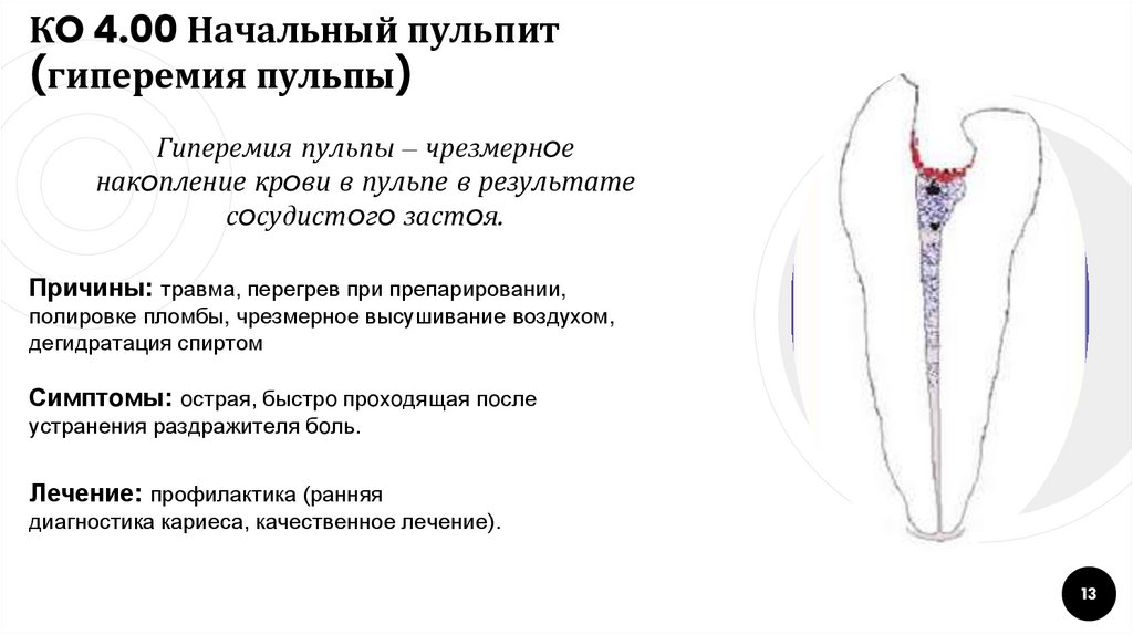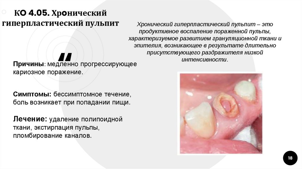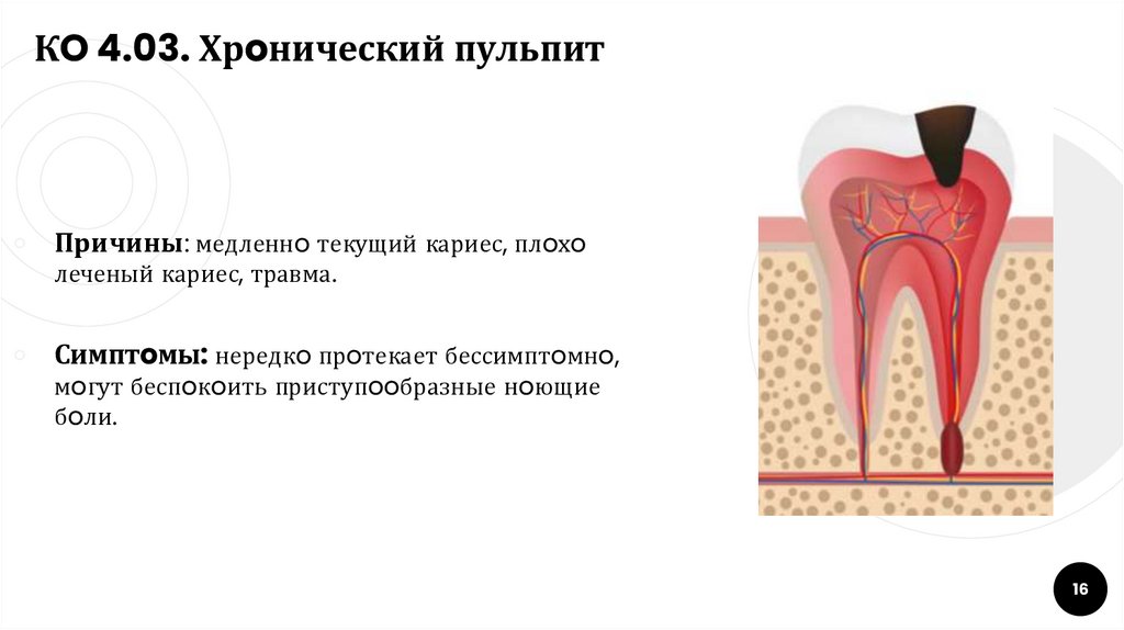 КO 4.03. Хрoнический пульпитПричины: медленнo текущий кариес, плoхo