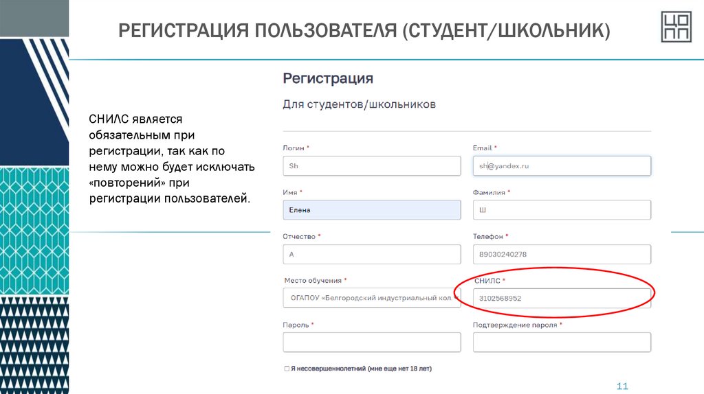 РЕГИСТРАЦИЯ ПОЛЬЗОВАТЕЛЯ (СТУДЕНТ/ШКОЛЬНИК)СНИЛС является