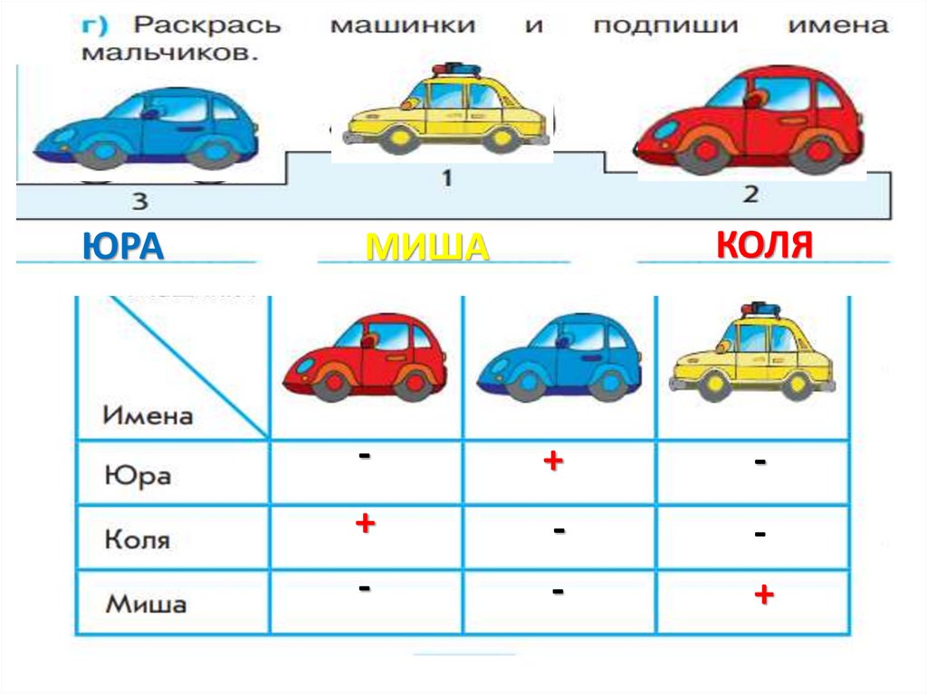 Раскрась машинки и подпиши имена мальчиков