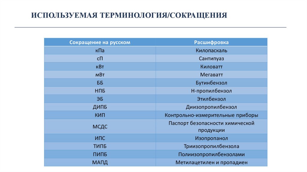 ИСПОЛЬЗУЕМАЯ ТЕРМИНОЛОГИЯ/СОКРАЩЕНИЯСокращение на русском