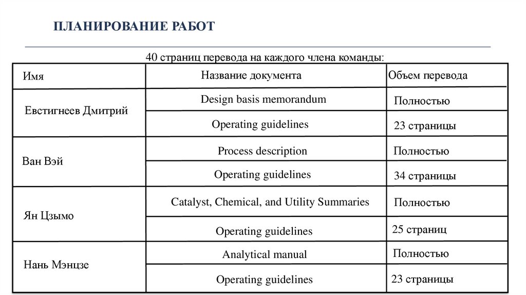 ПЛАНИРОВАНИЕ РАБОТ40 страниц перевода на каждого члена команды: