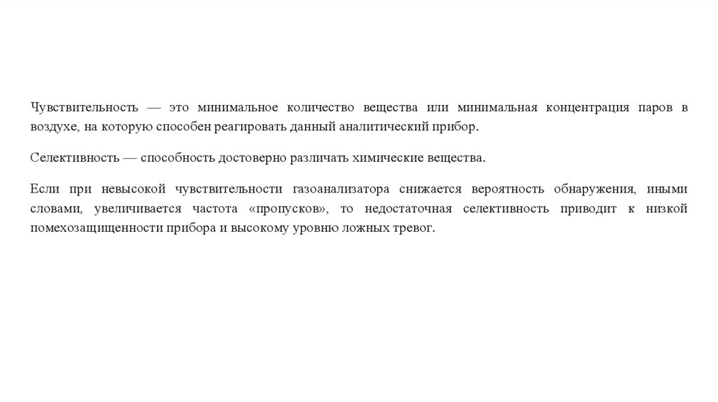 Чувствительность — это минимальное количество вещества или минимальная концентрация паров ввоздухе, на которую способен реагировать данный аналитический прибор.